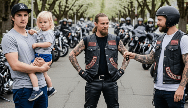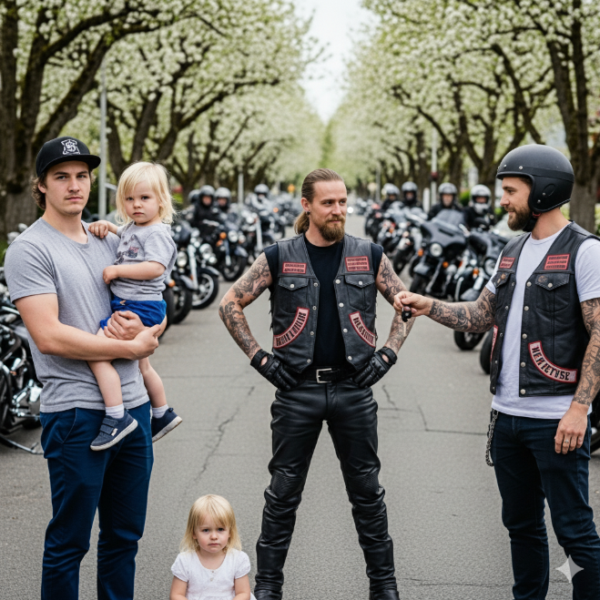 Devant la petite maison de location d’Adam. Plus de 40 motos étaient alignées le long du trottoir, telles des chevaux d’acier. Le chrome scintillait sous le soleil matinal. Les vestes arboraient des insignes inconnus de la plupart, mais immédiatement reconnaissables pour ceux qui connaissaient la rue. Adam se tenait sur le seuil, protégeant Lily derrière lui. Ses mains tremblaient légèrement, non pas de peur, mais d’ignorance.