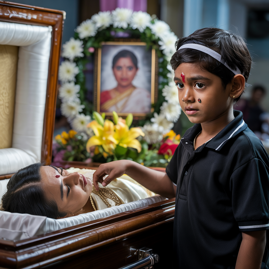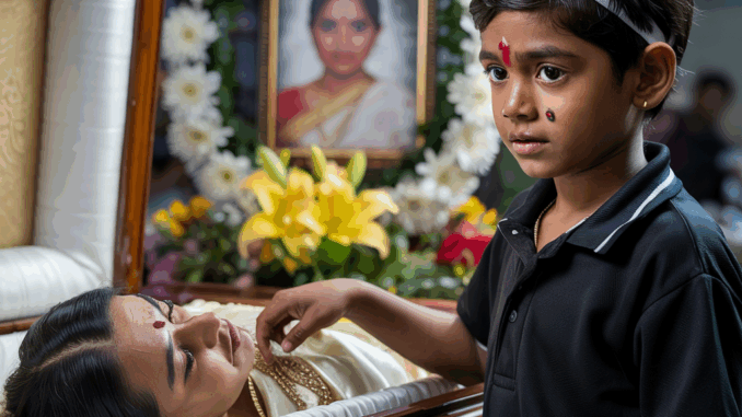 Les funérailles se déroulèrent rapidement, selon les coutumes du village. La fumée de l’encens se mêlait aux sanglots déchirants. Leur petite maison était plongée dans le chagrin. Arjun était assis en silence, les yeux creux, serrant un linge de deuil. Leurs enfants, de l’aîné au cadet, étaient agenouillés près du cercueil. Parmi eux se trouvait le petit Aryan, leur cadet, âgé de cinq ans seulement. Trop jeune pour appréhender pleinement la mort, ses yeux emplis de larmes parcouraient la pièce comme s’il cherchait quelque chose.