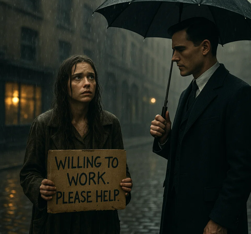 Enveloppée dans un manteau usé, deux tailles trop grand pour elle, ses longs cheveux auburn trempés, la jeune fille s’appuyait contre le mur de briques d’un café du centre-ville. Elle tenait une pancarte en carton sur laquelle était écrit simplement : « Prête à travailler. Aidez-moi, s’il vous plaît. »