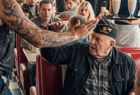 Le calme fut rompu lorsque la porte claqua et qu’une rafale de vent froid s’engouffra à l’intérieur. Tous les regards se tournèrent. Cole Tanner franchit la porte, un motard aux larges épaules, vêtu de cuir épais, dont les chaînes claquaient à sa marche. Ses bottes heurtèrent le sol avec une force délibérée, résonnant dans l’espace restreint. Le regard de l’homme scruta la pièce jusqu’à se fixer sur Harold. Quelque chose dans la présence calme du vétéran sembla le provoquer. Un ricanement aux lèvres, il se dirigea droit vers la table du coin.
