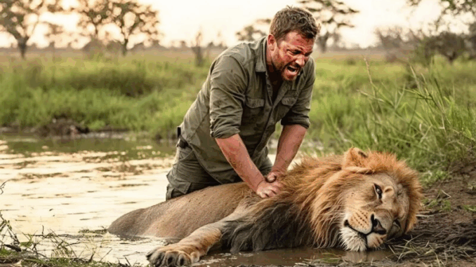 Le soleil flamboyant se couchait, teintant la savane de nuances orangées. Des touristes rentraient au camp après une longue journée de safari lorsqu’un d’eux remarqua un mouvement étrange près de la rivière. Dans les eaux troubles, une ombre massive se débattait. En s’approchant, l’homme comprit : c’était un lion. Le puissant prédateur, le majestueux roi des animaux, se noyait dans les profondeurs du fleuve, luttant désespérément pour ne pas sombrer.