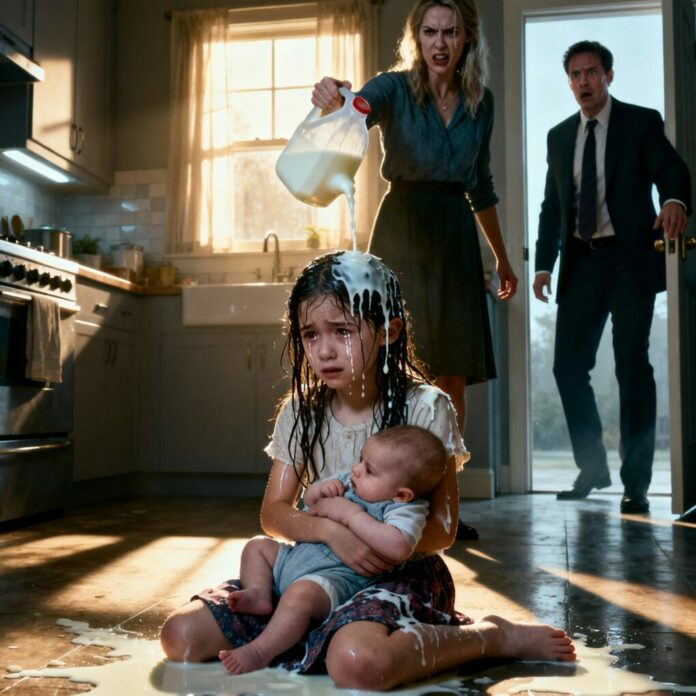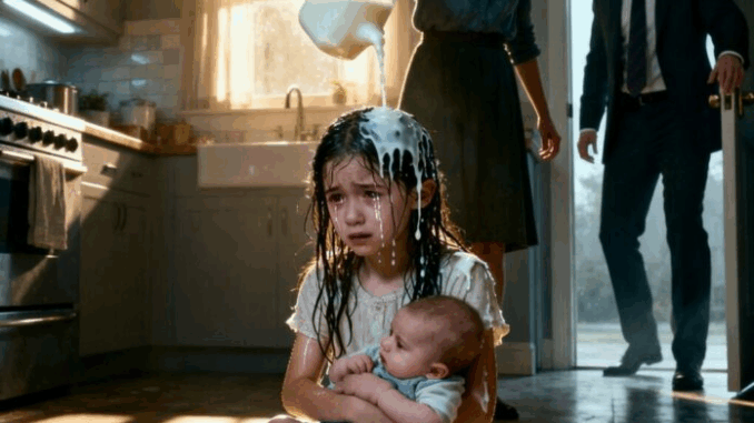 Emily était accroupie sur le carrelage, du lait dégoulinant de ses cheveux, sa robe trempée, des flaques d’eau s’étendant jusqu’à ses genoux. Elle serrait Alex contre elle, son petit visage enfoui dans son épaule. Debout au-dessus d’eux, le visage défait, Vanessa, brandissant le pichet de lait vide comme une arme, avait le visage déformé par la colère.