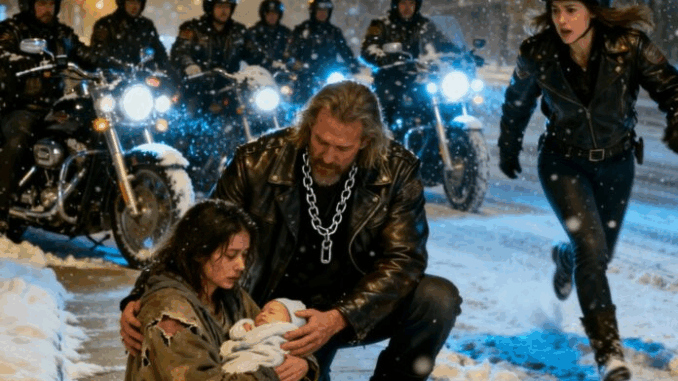 Jack Malone, le chef des Iron Riders, fut le premier à s’arrêter. Il sauta de sa moto, ses bottes crissant sur la glace. « Tenez bon ! Restez avec moi ! » cria-t-il, la voix tendue par-dessus le vacarme de la tempête. Son équipe le suivit rapidement, formant un cercle protecteur autour d’elle. Une des motardes, une femme nommée Lisa, s’accroupit près de Vanessa. « Ça va aller, tu n’es pas seule », murmura-t-elle.