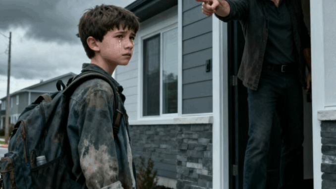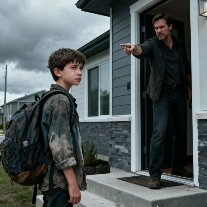 Elle représentait un enfant debout devant une maison sous la pluie… une porte fermée devant lui.