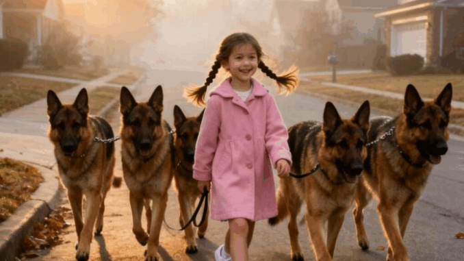Chaque matin, à sept heures précises, le quartier paisible de Maple Street était le théâtre du même spectacle étrange. Une petite fille, à peine âgée de six ans, déambulait tranquillement sur le trottoir, vêtue de son manteau rose, tenant cinq laisses attachées à d’imposants bergers allemands. Les chiens évoluaient en formation parfaite : un devant, un derrière, et trois de chaque côté, tels des gardes du corps dressés. Aucun adulte ne l’accompagnait. Personne ne savait d’où elle venait ni où elle allait.