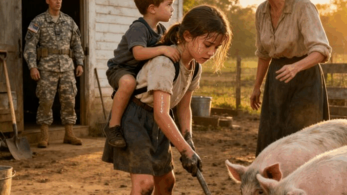 Emily, à peine âgée de neuf ans, était à l’intérieur, tentant de soulever un lourd seau de foin tout en portant Joshua, trois ans, sur son dos. Ses petites mains étaient gercées, son pull trop grand et crasseux. Joshua s’accrochait à elle comme s’il avait peur de la lâcher. Max se tenait près d’eux, protecteur, aboyant bruyamment comme pour les défendre contre le monde entier.