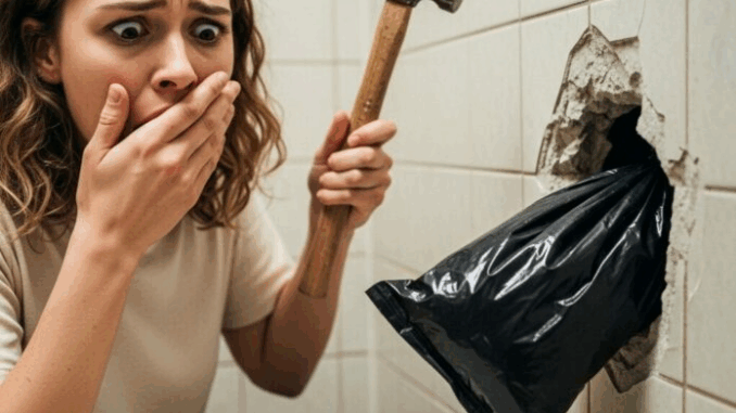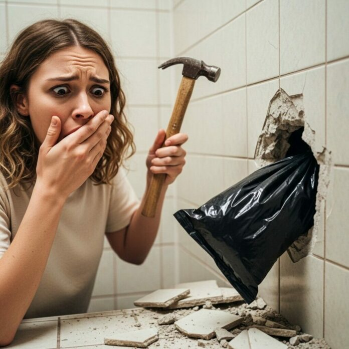 Le premier impact a provoqué une petite fissure. Le deuxième a projeté un morceau de carrelage. Mon pouls s’est accéléré. Au troisième, une section de carrelage s’est détachée complètement, révélant un espace vide. J’ai éclairé l’intérieur avec la lampe torche de mon téléphone… et je suis resté figé.