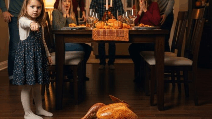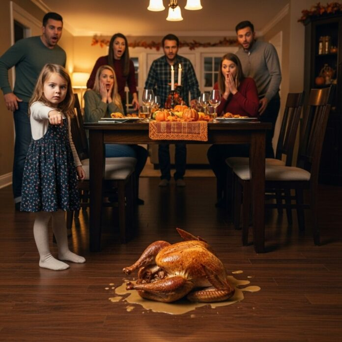 Au dîner de Thanksgiving, ma fille de cinq ans s’est mise à hurler, a couru vers la table et a jeté la dinde entière par terre. Toute la famille s’est figée. Je me suis agenouillée, essayant de garder mon calme, et je lui ai demandé : « Pourquoi as-tu fait ça ? » Elle haletait, levant les mains comme si elle venait de sauver le monde. « Parce que j’ai sauvé tout le monde ! » Personne n’a compris…