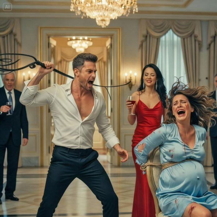 Les premiers coups résonnèrent dans la pièce comme le tonnerre. Chaque impact affaiblissait Claudia, la forçant à se plier en deux pour protéger son bébé. Le sang commença à tacher sa robe bleue. Personne n’osait bouger. Valeria observait la scène d’un air indifférent, sirotant du champagne.