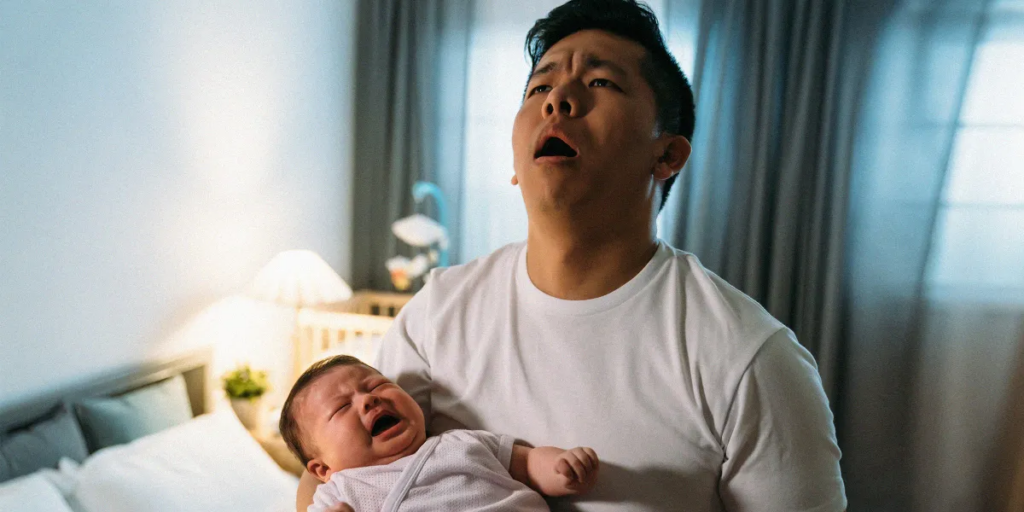 James, l’air fatigué, tient Lily dans ses bras | Source : Midjourney
