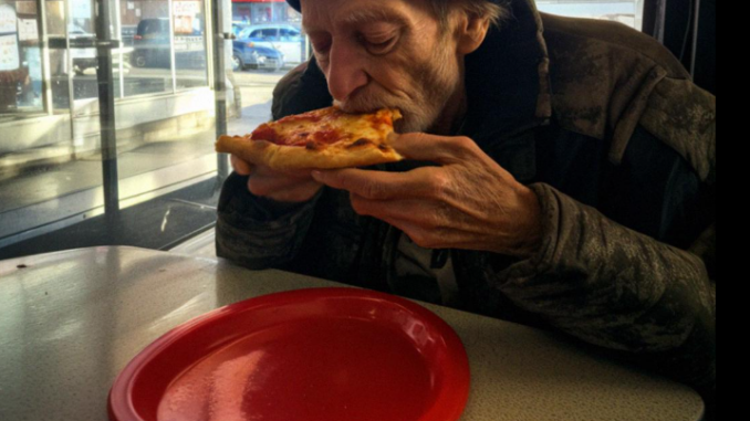 Elle paya sa part de pizza et son soda de sa poche. L’homme, la soixantaine peut-être, était assis dans un coin, penché sur sa nourriture comme si elle allait disparaître s’il détournait le regard. Elle essuya le comptoir, puis prit une chaise et s’assit en face de lui.