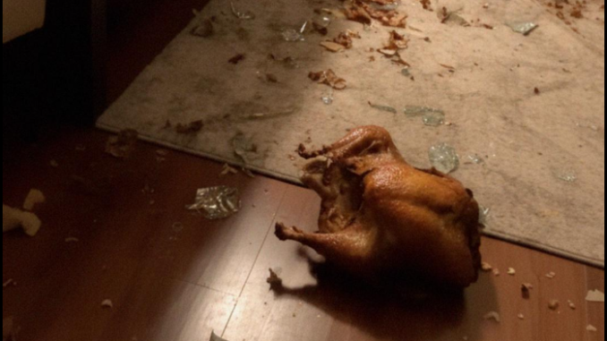 Des exclamations de surprise emplirent la pièce lorsque la dinde s’écrasa lourdement au sol. De la sauce gicla sur le carrelage, de la sauce aux canneberges s’étala sur la céramique blanche, et un silence stupéfait s’abattit sur la pièce.
