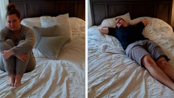 « Allez, chérie, dis-je. Je voulais juste m’assurer que tout soit équitable. Puisque je paie 70 % du lit, je pensais que je devais avoir la plus grande partie de l’espace. Ça fait tes 30 %. »